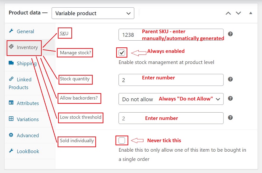 - Sold individually : This is always disabled. Never tick this box, as it will limit the product to one per order.