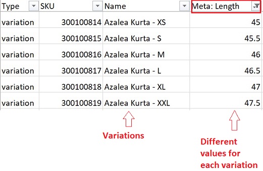 | This will have a single entry (could be a measurement or size) | Here all possible variation values to be entered | Enter only variation specific value |