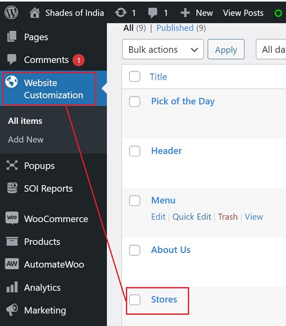 Click on Website Customization -> Stores on the left side panel.